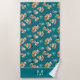 Emmenez votre instinct tribal à la plage avec cette mignonne serviette de plage ! Il comprend deux mignons renards rouges, un assis et un debout. Chacun des renards est habillé en motifs tribaux de style boho. Les renards sont accompagnés de motifs tribaux en feuilles et en plumes. Une flèche tribale et une conception cardiaque, et un mignon petit écureuil brun complètent le motif. Une bordure turquoise solide en bas tient votre monogramme avec votre nom écrit en script à travers.