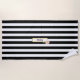 Chic serviette de plage à rayures noir et blanc personnalisée, avec une jolie plaque en noir, encastrée dans une bordure dorée et un rose de pêche d'été dans le coin. Vous pouvez personnaliser le nom dans un texte élégant et changer les couleurs pour en faire un cadeau parfait pour vous-même ou un cadeau spécial pour un ami ou un membre de votre famille.