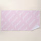 Cette serviette de plage est d'un arrière - plan rose pâle et porte un nom qui se répète en blanc.