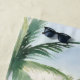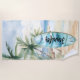 Plage de sable couleur eau, vagues de l'océan et palmiers en arrière - plan, planche de surf bleue sur la plage. Personnalisez et ajoutez un nom.
