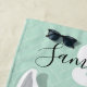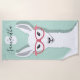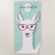 Une serviette de plage avec un lama illustré qui porte une paire de lunettes flamands roses. Le lama se trouve en face d'un arrière - plan en écorce vert clair et la serviette est conçue avec un nom et un monogramme personnalisables. Les couleurs sont le blanc, le vert clair et le rose.