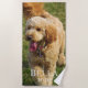 Cette mignonne serviette de plage de chien de chevet doré présente une photo d'un chiot au parc. Ajoutez votre propre nom personnalisé pour faire de ce design votre propre ! Photographie créée par la photographe primée Maria Jeffs.