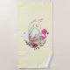 Un drap de plage avec une peinture à l'aquarelle représentant un œuf vert pâle posé dans un panier en osier. Décoré de rubans, de nœuds, de fleurs et de petits cœurs. Un flamant rose et un lapin blanc sont à ses côtés. Fond jaune pâle.