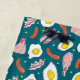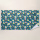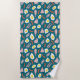 Serviette de plage colorée et originale, imprimée avec des illustrations dessinées à la main d'oeufs au plat, de bacon et de saucisses sur un arrière - plan bleu foncé. Un cadeau parfait pour les cuisiniers du petit-déjeuner et les cuisiniers du diner !