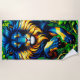 Cette serviette de plage est ornée d'oeuvres d'art de lions.