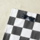 This beach towel has a pretty checkerboard print. With illustrations of painted black squares alternated with plain white squares. The lower edge of the towel is ready to be personalized with a name (or other custom text) in black script lettering.