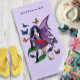 Jolie fée aux cheveux noirs tout en violet et rouge assis sur un champignon dans un fond de violet