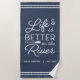 Upgrade your outdoor setup at your riverside abode with this cute personalized beach towel featuring the phrase "life is better on the river" in white lettering accented with an anchor and an oar. Personalize with your family name and/or year established beneath. Great for housewarmings, summer homes, or vacation rentals.