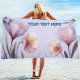 Wrap yourself in style with this beautiful watercolor floral beach towel. Featuring delicate purple and peach blossoms on a soft lavender background, this towel offers a serene and elegant look. Personalize it with "YOUR TEXT HERE" to make it uniquely yours or create a thoughtful gift. Perfect for beach days, pool sides, picnics, or simply adding a touch of nature-inspired beauty to your home. Made from soft, absorbent material for ultimate comfort and quick drying.