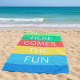 Joyeuse serviette de plage de couleur vive avec jade et vert citron, rouge corail, jaune soleil vif, ciel et bleu azur rayures motif, et amusant ICI VIENT LE texte de citation du soleil. Célébrez l'été... l'heure de la plage, de la piscine, du plaisir !