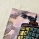 aquarelle traditionnelle d'un phare debout sur une île verte avec un coucher de soleil coloré et des montagnes lointaines dans l'arrière - plan sur une serviette de bain