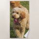 Cette mignonne serviette de plage photo de chien doré présente une adorable photo d'un chiot Golden Doodle. Ajoutez votre propre message personnalisé pour que ce design soit le vôtre ! Photographie créée par la photographe primée Maria Jeffs.
