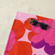 Serviette de plage motif Popflower rose vif, violet sur fond rose pale avec votre prénom. Texte modifiable.