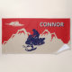 Gardez votre cool même par une chaude journée à la plage avec cette serviette et son cool graphique sur le thème de l'hiver. Cette serviette de plage est de style vintage illustration d'une motoneige et d'un coureur en bleu marine, sur fond de montagnes couleur crème ou ivoire contre un arrière - plan rouge. Il est prêt à être personnalisé avec un nom en lettres crème et bleu.