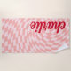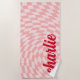 Serviette de plage avec un motif en damier tordu et rose pâle et votre nom dans une police rouge de style rétro.