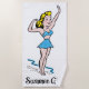 Cette remise à zéro moderne d'une rétro illustration de la publicité va voir bruit-art et comporte une beauté blonde de plage dans un bikini bleu et blanc de point de polka.