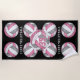 "I love volleyball", une serviette de plage personnalisée pour filles, est équipée d'un motif de volley-ball rose, gris et blanc arrangé dans un motif miroir avec le texte "I love volleyball" en gris clair entre les rangées de volley-ball - son nom et son numéro de maillot sont personnalisables sur un volley-ball rose, gris et blanc plus grand, couleur arrière - plan noire - par katz_d_zynes