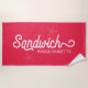 Cette serviette de plage présente le texte Sandwich, Massachusetts dans une police nautique blanche avec des accents d'étoiles de mer. L'arrière - plan est de couleur rose vif, mais peut être changée en n'importe quelle couleur de votre choix. Parfait pour la décoration sur la plage, la côte ou la mer.