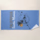 Serviette de plage caractéristiques Californie en couleur grise avec Père Noël Monica dans une police moderne en écriture blanche avec des palmiers géométriques et des montagnes logo graphique sur arrière - plan bleu