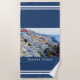 Serviette de plage bleue de 70" x 35" de l'île grecque de Santorin, classique Thera et officiellement Thira. Bordures blanches à double bande. Santorin est une île du sud de la mer Égée, à environ 200 km au sud-est de la Grèce continentale. C'est la plus grande île d'un petit archipel circulaire du même nom, vestige d'une caldeira volcanique. Voir l'ensemble de la collection Greece Beach Towel dans la section HOME.