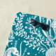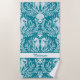 Cette serviette de plage côtière personnalisée est décorée dans un style damassé, motif avec des hippocampes, des algues, des coraux et des coquillages, dans des tons turquoises et blancs.
