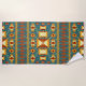 Serviette de plage avec rayons Soleil Doré du Sud-Ouest avec image de design d'oeuvre de TheFabricSeal à Zazzle. Design élégant et coloré avec des couleurs vives orange doré, rouge indien, crème dorée, bleu turquoise et vert plus couleur terre brun ajouté. L'art spirituel tribal indien de l'Amérique du Sud a influencé la conception de style pour les couvertures, les tapis et les tapis.