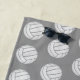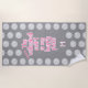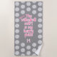 Cette serviette de plage sur le thème du volley-ball est composée de la phrase typographique mixte "Le terrain de beach volley est mon endroit heureux" en rose et blanc et monogramme du joueur sur un arrière - plan gris moyen entouré d'un petit motif de volley-ball blanc - par katz_d_zynes
