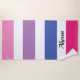 Cette serviette de plage design est décorée de rayures audacieuses de rose, violet, bleu et blanc avec typographie noire. Customisez-le en changeant le nom ou en le faisant un monogramme à la place.