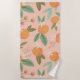 Cette serviette de plage est ornée d'un motif coloré illustré d'oranges, de fleurs tropicales et de feuilles sur un arrière - plan rose clair.