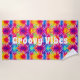 Serviette de plage amusante avec un arrière - plan de teinture rétro coloré avec le texte "super vibes" hippie personnalisable.