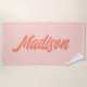 Profitez du soleil et détendez-vous avec élégance avec cette serviette de plage personnalisée Retro Peach Pink Vintage. Ce design simple a un arrière - plan rose pêche corallien rousse. Vous pouvez changer à n'importe quelle couleur que vous voulez. Personnalisé dans gros script rond plus foncé pêche sur le centre.