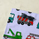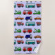 Cette serviette de plage a un design novateur de camions et de bus en rouge, bleu, vert et marron sur un terrain de bleu clair.