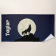 Montrez votre côté sauvage avec cette serviette de plage personnalisée. Il présente une illustration en silhouette d'un loup en noir hurlant sur une lune jaune pâle contre un arrière - plan de nuit bleu, ce qui le rend parfait pour quiconque aime les animaux. Cette serviette est prête à être personnalisée avec un nom ou un autre texte en caractères jaunes gras.