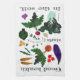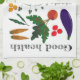 Oignons, chou, aubergine, tomates, haricots, et betteraves peintes avec le texte "débuts de bonnes santés dans le sol". ©TR FORSMAN. PEINTURE ORIGINALE DES LÉGUMES TEXTURISÉS.