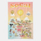 Caricature de charme de la Californie du Sud - Los Angeles, Orange County, et San Diego avec des scènes classiques de Californie - un surfeur pend dix tandis qu'un orque saute de l'eau, un couple de plage musclé à flex à impressionner, des animaux de zoo attendent les touristes et beaucoup plus...