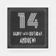 Cette serviette en papier inspirée du style des années 1920/1930 est décorée d'un grand modèle Art Déco inspiré du numéro "14", du message "HAPPY 14th BIRTHDAY", d'un nom personnalisable et d'un motif de frontière composé de lignes. Des serviettes en papier sur le thème de l’anniversaire comme celle-ci pourraient être utilisées lors d’une fête célébrant le 14e anniversaire de quelqu’un. [~Z0000395]