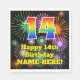Ce design passionnant et joyeux sur le thème de l'anniversaire de la serviette en papier comprend un grand nombre de "14" avec un dégradé coloré du spectre arc-en-ciel inspiré motif, avec le message "Happy 14th Birthday,", et un nom personnalisé. L'arrière - plan présente un motif passionnant et coloré, inspiré par des feux d'artifice de célébrations. Des serviettes en papier comme celle-ci pourraient être utilisées lors d’une fête organisée pour célébrer le 14e anniversaire de quelqu’un. [~Z0000574]