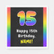 Ce design joyeux et amusant de serviette en papier sur le thème de l'anniversaire comprend un grand nombre de "15" ayant un motif dynamique du spectre arc-en-ciel inspiré, avec le message "Joyeux 15e anniversaire", et un nom de destinataire personnalisé. Des serviettes en papier comme celles-ci peuvent être utilisées pour célébrer le quinzième anniversaire de quelqu’un. [~Z0000629]