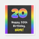 Cette conception audacieuse et passionnante de serviette en papier d'anniversaire comporte le numéro "20" avec un motif multicolore inspiré du spectre arc-en-ciel, ainsi que le message "Joyeux 20e anniversaire", et un nom de destinataire personnalisable. Des serviettes en papier comme celles-ci pourraient être utilisées lors d’une fête d’anniversaire organisée pour célébrer le 20e anniversaire de quelqu’un. [~Z0000629]