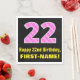 Ce design joyeux et amusant de serviette en papier à thème d'anniversaire comporte un grand numéro "22" avec un motif rayé contenant des formes cardiaques colorées rose foncé et rose pâle. Il comporte également le message de voeux d'anniversaire "Joyeux 22e anniversaire", et un nom modifiable. Des serviettes en papier comme celle-ci pourraient être agréables à avoir lors d’une fête en l’honneur du 22e anniversaire de quelqu’un. Cela pourrait aussi être un choix amusant pour quelqu'un qui a un anniversaire qui tombe le 14 février (Saint-Valentin), en raison de ses symboles et couleurs de coeur aimés. [~Z0000436]