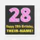 Cette conception amusante et joyeuse de serviette en papier à thème d'anniversaire dispose d'un grand nombre "28" avec un motif rayé rose clair et rose foncé contenant des formes cardiaques. Il comporte également le message de voeux d'anniversaire "Joyeux 28e anniversaire", et un nom personnalisé. Des serviettes en papier comme celle-ci peuvent être amusantes à utiliser lors de la fête du vingt-huitième anniversaire de quelqu’un. Cela pourrait aussi être un choix amusant pour quelqu'un dont l'anniversaire tombe le 14 février (Saint-Valentin), en raison de ses symboles et couleurs de coeur aimés. [~Z0000436]