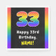Cette serviette d'anniversaire joyeux et accrocheuse est dotée du numéro "33" avec un motif dégradé coloré inspiré du spectre arc-en-ciel, avec le message "Happy 33rd Birthday," et un nom de destinataire personnalisable. Des serviettes en papier comme celles-ci pourraient être utilisées pour organiser une fête pour quelqu'un en l'honneur de leur 33ème anniversaire. [~Z0000629]