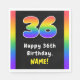 Cette conception captivante et optimisée de serviette d'anniversaire comporte un grand nombre de "36" avec un motif multicolore de spectre arc-en-ciel inspiré de dégradé, avec le message "Happy 36th Birthday," et un nom de destinataire modifiable. Des serviettes en papier vibrantes comme celles-ci pourraient être utilisées pour organiser une fête pour quelqu'un à l'occasion de leur 36e anniversaire. [~Z0000629]