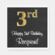 Ce design élégant, élégant et sophistiqué de serviette d'anniversaire comporte un grand numéro ordinal "3ème" avec une imitation/faux look or, en plus du message de voeux d'anniversaire "Happy 3ème anniversaire", et un nom modifiable dans une police de style script. L'arrière - plan est noir de couleur. De luxueuses serviettes en papier comme celle-ci peuvent être amusantes à utiliser lors d’une fête d’anniversaire en l’honneur du 3e anniversaire de quelqu’un. [~Z0000516]