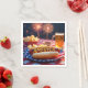 Un cadre festif présente un hot dog sur une assiette patriotique, avec le mot "AMÉRIQUE" écrit en moutarde