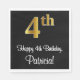 Ce design luxueux, sophistiqué et élégant de serviette en papier à thème d'anniversaire comporte un grand numéro ordinal "4th" ayant une apparence fausse/imitation d'or, ainsi que le message de voeux d'anniversaire "Happy 4th Birthday," et un nom personnalisé dans une police de style script. Il dispose également d'une arrière - plan de couleur noire. Des serviettes en papier comme celle-ci peuvent être utilisées lors d’une fête d’anniversaire organisée pour célébrer le quatrième anniversaire de quelqu’un. [~Z0000516]