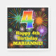 Cette conception joyeuse et joyeuse de serviette en papier à thème d'anniversaire comporte un grand nombre de "4" avec un dégradé coloré arc-en-ciel inspiré motif, avec le message "Happy 4th Birthday,", et un nom personnalisé. L'arrière - plan est décoré d'un motif vibrant et coloré inspiré par l'allure d'un feu d'artifice festif éclatant. Des serviettes en papier colorées comme celle-ci peuvent être amusantes à utiliser lors d’une fête organisée en l’honneur du 4e anniversaire de quelqu’un. [~Z0000574]