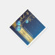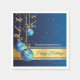 Add sophisticated festive charm to your holiday table with these luxury Christmas paper napkins, featuring beautiful blue and gold baubles suspended from delicate gold ribbon tendrils that sweep gracefully down the left side of the design. Set against a rich dark blue background sprinkled with subtle star accents, the artwork feels both elegant and modern.