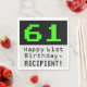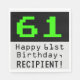 Cette conception amusante et geeky de papier d'anniversaire de conception dispose d'un grand classique vert de jeu d'ordinateur numéro "61" sur un arrière - plan de couleur noire. Il contient également le message de voeux d'anniversaire "Joyeux 61e anniversaire", ainsi qu'un nom qui peut être modifié. Des serviettes en papier amusantes et geeky comme celle-ci pourraient être utiles lors d'une fête organisée pour célébrer le soixante et unième anniversaire d'un programmeur informatique, d'un ingénieur ou d'une personne qui aime jouer en vidéo classique. [~Z0000404]