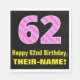 Ce modèle de serviette en papier à thème d'anniversaire joyeux et amusant comporte un grand nombre de "62" avec un motif rayé rose clair et rose foncé contenant des formes cardiaques. Il comporte également le message de voeux d'anniversaire "Joyeux 62e anniversaire", et un nom modifiable. Des serviettes en papier comme celle-ci peuvent être amusantes à utiliser lors de la célébration du 62e anniversaire de quelqu’un. Cela pourrait aussi être un choix amusant pour quelqu'un dont l'anniversaire tombe le 14 février (Saint-Valentin), en raison de ses symboles et couleurs de coeur aimés. [~Z0000436]